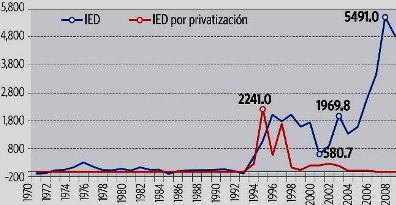 La IED repunta hacia 1992-94, cuando comienza el proceso de privatización, que se extiende hasta 1998 (ver gráfico). De allí en adelante, la IED toma un nuevo impulso por la inversión en actividades extractivas. Según el Ministerio de Energía y Minas, las inversiones en el periodo 1992-2008 en el sector minero y petrolero ascendieron a US$ 14,900 y 7,300 millones, respectivamente. Las inversiones en estos sectores han sido la punta avanzada de la orientación primario exportadora de la economía peruana en los últimos 20 años.