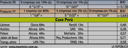 En el Perú, la consultora Maximixe calculó el IHH para una serie de mercados en el 2006. En los lácteos, el IHH es 0.49 (Gloria tiene el 68%), mientras que en aceites, fideos y jabón de lavar es 0.38, 0.37 y 0.71, respectivamente (Alicorp está primero en los tres). En el transporte aéreo el IHH es 0.59 y LAN Chile está primero con el 75% del mercado (el IHH debe haber aumentado desde el 2006).