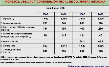 Un simple estimado de las regalías mineras dejadas de pagar al fisco por Mra. Antamina equivalentes al 3% del valor del concentrado o su equivalente de cobre, zinc, plata y molibdeno en el período 2005-2008, equivaldrían a no menos de 300 millones de dólares. Si bien el reglamento de la ley de regalías estima que a los valores de los concentrados o su equivalente se le deben deducir los costos directos e indirectos, esta resultaría una estimación conservadora en razón de los importantes ingresos obtenidos por la Mra. Antamina como se expone en el cuadro. “Ingresos, Utilidad y Contribución Fiscal de Cía. Minera. Antamina”.