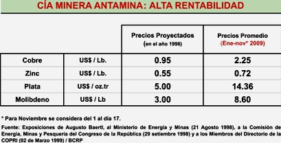 En verdad, en los primeros 10 años (2001-2010) de operaciones, la viabilidad del proyecto de Antamina al margen del recupero de la inversión, ha obtenido ingresos y utilidades muy por encima de los ingresos proyectados en 1998. Así, se aseguraba una rentabilidad del 14% con niveles de precios de US$ 0.95 la libra de cobre, US$ 0.55 la libra de zinc, US$ 5 dólares la onza de plata y US$ 3 dólares la libra de molibdeno. Como se puede observar en el cuadro” Cía. Mra. Antamina: Alta Rentabilidad”, donde se comparan los precios estimados en el proyecto frente a los precios promedio del 2009 (Enero/Noviembre)