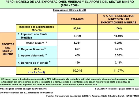 En tal sentido, el cuadro “Perú: Ingreso de las Exportaciones Mineras y el Aporte del Sector Minero” 2004-2009 expresa con crudeza la real contribución fiscal de la minería en nuestro país, que en el período mencionado ha pagado 8,799 millones de dólares por concepto de impuesto a la renta, 627 millones de dólares por regalías, 459 millones de dólares por el llamado aporte voluntario, y 160 millones por los derechos de vigencia que se abonan por las concesiones mineras.