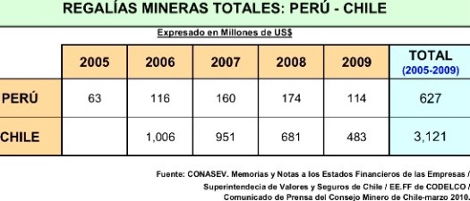Así, las empresas mineras que operan en el Perú en el 2006 pagaron 116.4 millones dólares, mientras en Chile abonaron US$ 1,006.4 millones, esto es 8 veces más. En el 2007 durante el apogeo del boom minero en nuestro país pagaron 160 millones de dólares mientras en el vecino del sur abonaron 951 millones de dólares. En el 2009 en nuestro país se recaudaron por regalías 114 millones en tanto en Chile alcanzaron los 483 millones de dólares, esto representa cuatro veces más. Ver cuadro “Regalías Mineras Totales: Perú-Chile”.