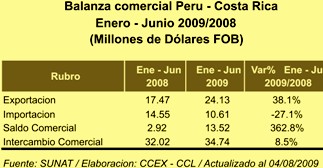 Según el Centro de Comercio Exterior (CCEX) de la Cámara de Comercio de Lima (CCL), Perú le vendió a Costa Rica productos por un valor de US$ 24,13 millones durante el primer semestre de este año, lo que significó un incremento de 38,1% en comparación con lo registrado en el mismo período de 2008.