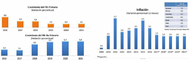 El BCR estima un aumento del déficit fiscal para el 2017 -2018 que se irá reduciendo en años posteriores pero si las condiciones no mejoran el déficit nos pondría al borde del precipicio. Sin embargo, el BCR persiste en mantener una inflación ajustada a la baja en vez de expandir inversiones, con estímulos financieros. Tiene esperanzas en que la producción no primaria (Industria) será el motor de la recuperación económica. Las proyecciones inflacionarias del BCR y sus proyecciones sobre la marcha de nuestra economía son como se muestra en los gráficos correspondientes.