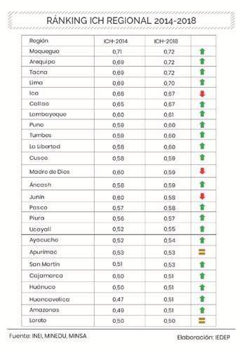 Índice de Capital Humano (ICH) del Banco Mundial (BM) determina las habilidades y destrezas de las personas con capacidad de desempeñarse como miembros productivos de la sociedad. Aplicando la metodología del BM para cada región del país, el Instituto de Economía y Desarrollo Empresarial (IEDEP) de la Cámara de Comercio de Lima determinó que 20 regiones lograron mejorar su capital humano en el periodo 2014-2018.