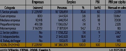 Pero los promedios engañan. Por eso, es muy útil el trabajo de Fernando Villarán sobre las micro y pequeñas empresas (1), donde se analizan los distintos tipos de empresas, así como su participación en el total de empleo y, también, en el PBI, a partir de la Encuesta Nacional de Hogares (Enaho) del 2006. Dice Villarán que en el sector privado hay 3’229, 197 empresas que emplean a más de 10 millones de personas (el 70% del total de la Población Económicamente Activa, PEA) y generan el 82% del PBI.