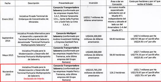 Y la conclusión fue insólita: “-En noviembre del 2016, el Consorcio Transportadora Salaverry (conformado por las empresas Impala Perú y Tramarsa-Grupo Romero) reformuló por segunda vez su propuesta y presentó la Iniciativa Privada para la Modernización y Desarrollo del Terminal Portuario Multipropósito de Salaverry reformulada con una inversión US$ 215,765.250 millones de dólares americanos, con un área de terreno dada en concesión de 126.2 hectáreas.