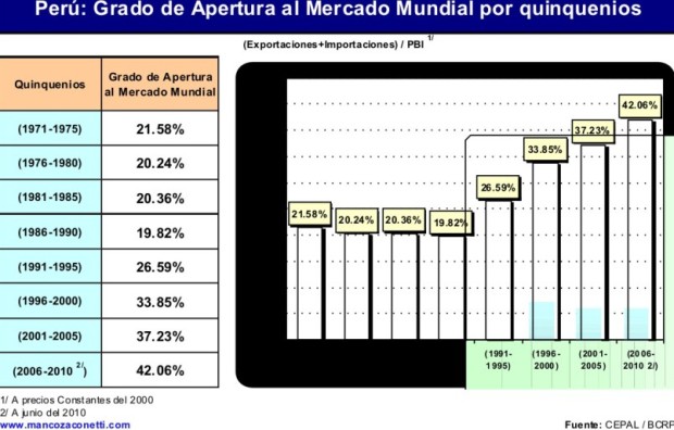 Por ello, nos permitimos exponer un cuadro que mide el grado de apertura de la economía peruana estimado por la suma de las exportaciones e importaciones como participación en la producción nacional (PBI), desde 1971 al 2010, considerando los quinquenios desde 1971 hasta el 2010. Es verdad, que la economía peruana es cada más abierta al mundo con un grado de inversión superior al 40% sobre todo en la bonanza minera del 2004 al 2008. Es más, se supone que los diversos tratados de libre comercio con terceros países debieran fortalecer tales tendencias para llegar a igualar o superar a nuestro vecino del sur que tiene un grado de apertura superior al 80%. Ver Cuadro de “Perú: Apertura al Mercado Mundial por Quinquenios”