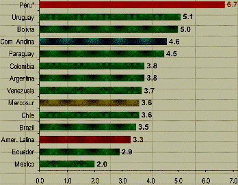 En el caso de los países que oscilarían con dinamismos económicos de alrededor del 3% estarían Argentina (3.8%), Colombia (3.8%), Venezuela (3.7%), Chile (3.6%) y Brasil (3.5%).
