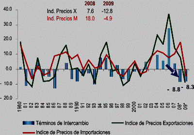 De esta manera, proyecta que los precios de los productos exportados durante el 2009 se reduzcan 12.8%; mientras que para el caso de las importaciones la caída se estima en 4.9%.