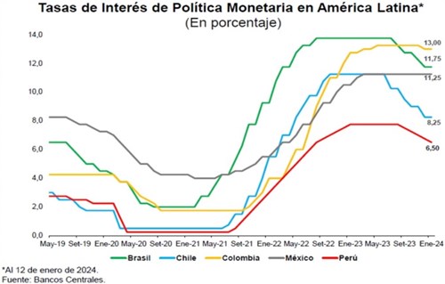 Igualmente, la tasa de interés real del Banco Central de Reserva del Perú, que resulta de la diferencia de la tasa de interés nominal menos las expectativas de inflación a 12 meses, se redujo a 3.67 % en enero, siendo también la más baja de las principales economías de la región.