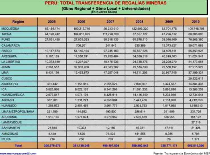 Si bien las regalías mineras no resultan significativas como el canon minero, el comportamiento del 2010 en relación al 2009 ha sido de un aumento significativo al pasar de 339 millones de nuevos soles a 605 millones en el 2010 con tendencia al aumento, pues en la medida que finalicen los contratos de estabilidad tributaria las empresas estarían obligadas a pagar las llamadas regalías mineras. Ver cuadro sobre “Total de Transferencias de Regalías Mineras por Departamentos”.