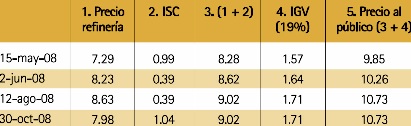 En junio del 2008, el precio de Petroperú subió a S/. 8.23/galón, pero el ISC se redujo en una cantidad apreciable (de S/. 0.99 a 0.39 por galón). De todas maneras, el precio de venta al público subió a S/. 10.26/galón, en un contexto en que los precios internacionales seguían subiendo. Sin embargo, al 30 de octubre, si bien el precio de refinería de Petroperú baja a S/. 7.98/galón, el gobierno esta vez subió el ISC a S/. 1.04/galón. Por ello, el precio de venta al público fue de S/. 10.73/galón, muy superior al precio de los meses de mayo y junio.