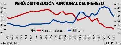 Con las utilidades sucedió algo distinto, pues estas comenzaron un ascenso gradual desde 1979 cuando saltaron al 32%, llegando al 40% en 1990. Pero su participación también fue afectada por el “fujishock” que la hizo bajar hasta 30.7% en 1994. La contrapartida de los salarios y de las utilidades es la creciente participación de los independientes (que no aparecen en el gráfico), cuya participación también ha venido creciendo en todo el periodo. Como se sabe, en el rubro “independientes” están desde los profesionales hasta los informales, pasando por los empleados del hogar.