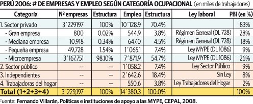 Esto lo demuestra el hecho siguiente: de los 530,000 empleos que se han creado en Lima en el periodo 2002-2009 según la Encuesta Permanente de Empleo (EPE) del INEI, 384,000 lo fueron en las empresas de más de 50 trabajadores, que se rigen por el DL 728. Solo 93,000 empleos se crearon en empresas de 11 a 50 trabajadores y 53,000 en empresas de 1 a 10 trabajadores, donde rige la Ley MYPE.
