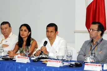 “No queremos quedarnos con la bonanza de los minerales, por eso debemos diversificar la economía y concretar la transferencia tecnológica con quienes quieren invertir en el Perú”, dijo el presidente Ollanta Humala en el desayuno con los empresarios que sostuvo en el Salón Cartagena del Hotel Caribe y al que acudió acompañado por la primera dama, Nadine Heredia, y el ministro de Comercio Exterior y Turismo, José Luis Silva y el ministro de Relaciones Exteriores Rafael Roncagliolo.