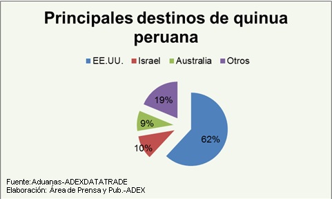 Alfredo Paredes, Gerente de Agro de ADEX, resaltó la evolución de ese grano andino peruano en los mercados internacionales, que en el 2007 se exportó a un total de 24 mercados, en el 2008 a 27, en el 2009 a 28, en el 2010 a 29 y en el 2011 a 35, entre los que se contaron países como Australia, Nueva Zelanda, Israel, Japón, Líbano, Rusia, Albania y Singapur.