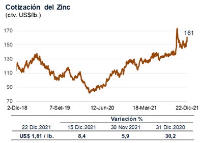 Entre el 15 y el 22 de diciembre, el precio del zinc se incrementó 8,4 por ciento a US$/lb. 1,61, informa el Banco Central de Reserva del Perú.
