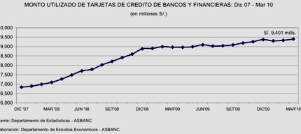 El monto utilizado de las tarjetas de crédito de las entidades bancarias y financieras registró un incremento al cierre de marzo, según informó la Asociación de Bancos del Perú (ASBANC).