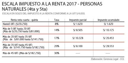 Con el Decreto Legislativo 1258, a partir del ejercicio 2017 los trabajadores perceptores de cuarta (independientes) y quinta categoría (en planilla) podrán deducir de sus ingresos anuales- aparte de las 7UIT fijas- gastos adicionales de hasta 3 UIT (S/ 12.015) siempre que presenten comprobantes de pago debidamente validados por la Sunat, informó el Centro Legal de la Cámara de Comercio de Lima (CCL).