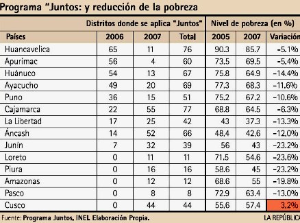 Analizando las cifras de «Juntos», no se ve una relación clara entre las regiones donde el programa tiene más tiempo y aquellos donde recién comenzó el 2007. Por el contrario, en Loreto, Piura, Amazonas, Pasco y Cusco, la pobreza se redujo bastante más que en los primeros. La excepción, para peor, fue Cusco, donde la pobreza aumentó a 57.4%.