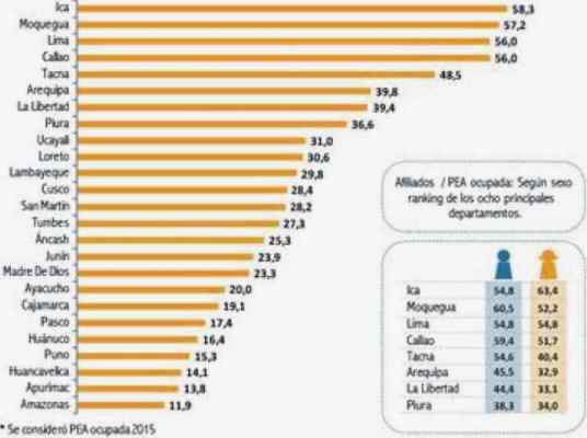 En el otro extremo, el IEDEP ha identificado hasta siete regiones (las menos competitivas) con una tasa de afiliación menor de 20%. Tal es el caso de Cajamarca (19,1%), Pasco (17,4%), Huánuco (16,4%), Puno (15,3%), Huancavelica (14,1%), Apurímac (13,8%) y Amazonas (11,9%).
