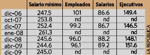 Algo parecido, aunque menos estrepitoso, ha sucedido con los sueldos y salarios reales, que son fijados en el mercado. En efecto, los sueldos reales han caído de 104.8 a 100.1 de diciembre del 2006 a abril del 2009. Esto quiere decir que los empleados ganan exactamente lo mismo que lo que en 1994. Con los salarios reales la cosa es parecida: si bien aumentan de 86.6 a 89.2 en el mismo periodo (ver cuadro), los obreros están ganando solo el 89% de su sobre de 1994. Para los asalariados, entonces, a pesar de tantos años de boom económico, el anunciado “chorreo” nunca llegó (1). Pero donde el aumento sí llegó fue a los Ejecutivos que, a abril del 2009, estaban ganando 51.6% más que en el 2004. Y hubo varios años de boom de las utilidades de las empresas, tema que no tocamos en este artículo.