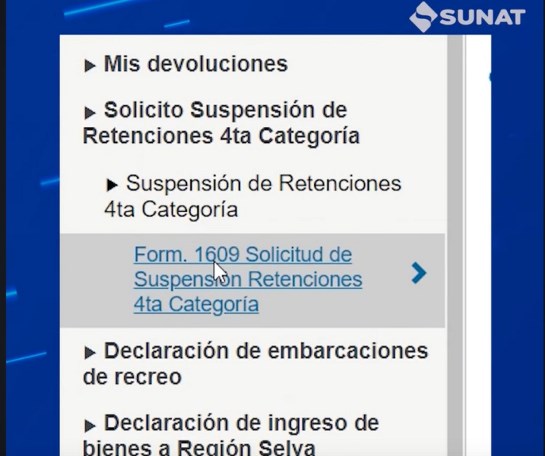 2. Ubicar la sección Otras declaraciones y Solicitudes, “Solicito Suspensión de Retenciones 4.ta Categoría” (Formulario Virtual 1609).