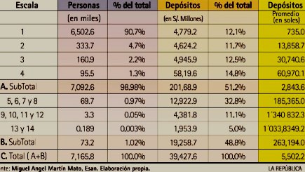 También se consigna el número de ahorristas y sus depósitos en la Banca Múltiple. Hay 7.165 millones de personas con ahorros totales de S/. 39,427 millones (línea C del cuadro). Así, el 90.7% de los ahorristas (6.5 millones de personas, Escala 1) tiene solo el 12.1% de los depósitos. Sumando las escalas 1, 2, 3 y 4 vemos que el 98.98% de los ahorristas tiene el 51% del total de depósitos.
