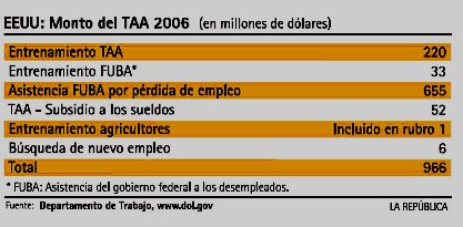 Hace pocos días, la lideresa del Partido Demócrata en la Cámara de Representantes de EEUU dijo que antes de votar el TLC con Perú, se tendrá que votar la extensión de la Ley de "Asistencia por Ajustes en el Comercio" (TAA, por sus siglas en inglés). Si bien esta pre-condición no parece poner en peligro el voto por el TLC (el Ejecutivo ya envió el proyecto de ley al Congreso y está corriendo el plazo para que sea votado), es importante remarcar el énfasis que los demócratas le dan a su compromiso con los trabajadores que pierden con el TLC. Algo que no sucede por estas tierras.