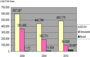 Esto se debe a la crisis financiera en la que aún se encuentran los EE. UU. y que amenaza con continuar por tiempo indefinido, y, el cierre del mercado venezolano, nuestro segundo destino. La cifra general no se revierte aún cuando otros mercados como el brasileño incrementó su demanda y se posicionó en el tercer lugar, desplazando a Colombia, Alemania, Italia y Argentina, entre otros (ranking de destinos del año pasado).