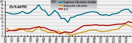 En el Perú, los ingresos tributarios del gobierno central han sido en promedio el 13.3% del PBI en el periodo 1970-2009, lo que nos ubica debajo del promedio de América Latina de 17.5% del PBI, según CEPAL. Una característica central son sus fuertes fluctuaciones (efecto serrucho).