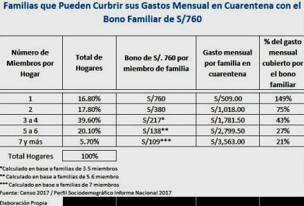 Según el informe técnico “Evolución de la Pobreza Monetaria 2007-2018” publicado por el INEI, el gasto por persona en el año 2018 fue de S/. 758 soles, si quitamos aquellos gastos que no se realizan en periodo de cuarentena[3], los gastos per cápita mensual serían de S/. 502. Según el Censo del año 2017[4] el 83.3% de los hogares está formado por 2 o más personas. Si a ello, se añade que el gasto promedio por persona en cuarentena es de S/. 502 soles; se puede concluir que Bono de S/. 760 no alcanza a cubrir el gasto mensual.