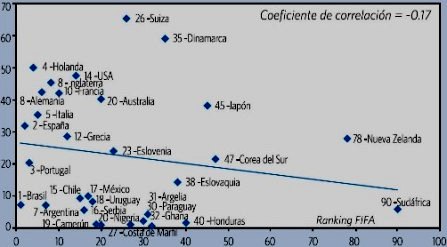 Al lado izquierdo del gráfico se ubican los mejor rankeados y allí están Brasil, España, Argentina, Inglaterra, Alemania, Italia, Uruguay, Chile y Camerún, entre los más importantes. Se ve que el PNB per cápita cuenta poco, pues hay grandes diferencias en los ingresos de esos mismos países. Visto de otra manera, Japón y Dinamarca, con altos PNB per cápita, tienen mucho menos ranking FIFA que Paraguay, Argelia y Ghana. El resultado es que el coeficiente de correlación de solo 0.17 (sobre 1), lo que indica que es casi inexistente.
