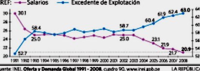 En el 2008, último año del “boom” de crecimiento económico, la participación de los salarios en el PBI continuó cayendo, como ha sucedido indefectiblemente cada año desde el 2002, cuando representaba el 25% del PBI. Hoy la cifra es de solo el 20.9%. Lo exacto inverso ha sucedido con las ganancias empresariales, pues el excedente de explotación subió de 58.7% del PBI en el 2002 a 63% en el 2008.