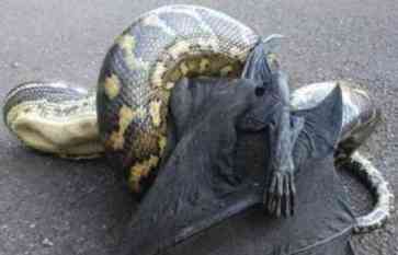 El investigador de fenómenos paranormales Reinaldo Ríos publicó en su cuenta de Facebook la foto de una serpiente atacando a un extraño animal del cual se ve el ala y una pata.