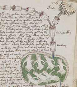 Los recipientes y tubos de la sección «biológica» podrían indicar una relación con la alquimia, lo que sería relevante si el libro contuviera instrucciones para la preparación de compuestos médicos. Sin embargo los libros alquímicos del periodo comparten un lenguaje visual común, en el que se representan los procesos e ingredientes por medio de imágenes específicas (el águila, el sapo, un hombre en una tumba, una pareja en la cama, el sol, etc.) o símbolos textuales convencionales (un círculo con una cruz, etc.); no se identifica ninguno de ellos en el manuscrito.