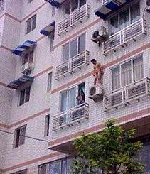 Una espectacular fotografía de un pecador desnudo escondiéndose del burlado marido de su amante en la fachada de un edificio de la China fue subida a internet.