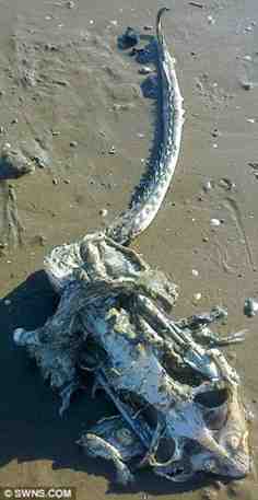 El esqueleto de un “monstruo marino” fue hallado varado en la playa británica de Weston-Super-Mare, Somerset Norte, por Lisa Worthington, de 42 años de edad, quien publicó las fotos en las redes sociales.