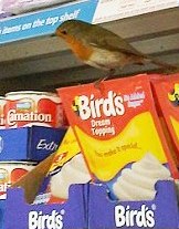 Una familia de petirrojos anidó en un supermercado londinense y uno de ellos escogió pararse en un estante, encima de un sobre de comida que dice: "pájaros".