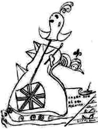 Las coincidencias con la actualidad abren el paso a la especulación. Como en varios de sus dibujos, Parravicini se refirió a algunos países dibujando su mapa, ajustándolo a alguna figura. Refuerza que es Inglaterra la bandera en su base.