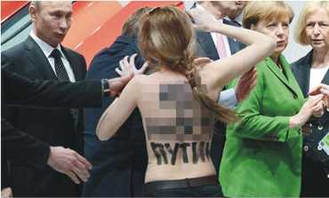 Cuando Putin y Merkel se acercaron al exhibidor de la compañía Volkswagen en la feria industrial, varias jóvenes del movimiento Femen se abrieron paso hacia los líderes, se quitaron las blusas y comenzaron a gritar consignas en inglés contra el presidente.