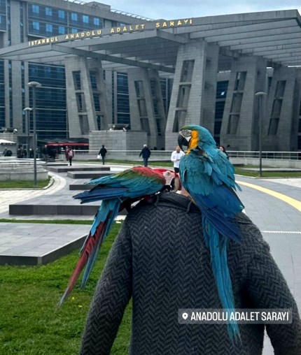Aunque no se ha revelado el nombre de la pareja, el abogado del demandante, Avukat Ted Buckland, tomó una fotografía de su cliente cuando se dirigía a la audiencia en el juzgado llevando en sus hombros a sus testigos, dos guacamayos de soberbia belleza, de plumaje azul con rojo y azul con amarillo respectivamente.