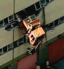 Tras la colisión del camión con el borde del edificio, grandes trozos de concreto cayeron sobre vehículos estacionados al pie del edificio, pero no hubo personas lesionadas.