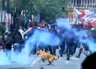 El labrador ya se ha hecho famoso por sus apariciones y tiene sus preferencias, siempre toma partido por los manifestantes al frente de ellos y lejos de amedrentarse por más represión que haya, ladra a la policía.