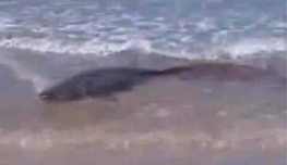 La orca se impuso sobre el tiburón, al que dejó malherido escapando en la arena, donde el escualo asesino de los mares cayó tan bajo que un perro se lo quiso comer.