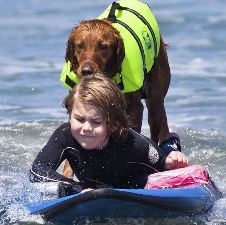 Dicha organización ayuda a surfear a toda clase de discapacitados y Ricochet juega un gran papel en ello, en el equilibrio en la tabla, pero también tranquilizando a los niños con su presencia.