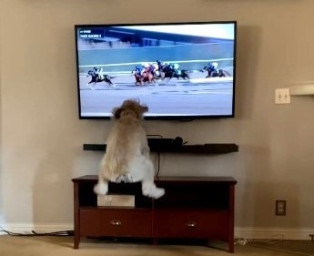 Una perrita que tiene afición por ver animales por televisión y sus favoritos son los caballos de carrera.