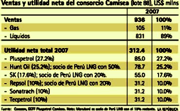 Así, en el 2007 las ventas del Lote 88 fueron US$ 936 millones, de los cuales el 89% provino de la venta de líquidos. Y la utilidad neta fue US$ 312 millones, de los cuales los socios del consorcio Perú LNG obtuvieron US$ 164 millones. ¿Acaso los ingresos de estas tres empresas por la venta del gas y, sobre todo, los líquidos del Lote 56 no van a financiar (en parte) el proyecto de exportación? ¿Cómo es posible, entonces, que se considere que el proyecto de exportación se considere como "independiente" y que deba financiarse solo con la venta del gas?