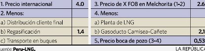 Un segundo tema es comprarle el gas a Perú LNG para que no se exporte. ¿Qué cosa, dirán algunos? Veamos. Sucede que el precio en el Perú es “netback”: se determina restando al precio en México todos los costos del proceso. El precio actual en México es US$ 4/MMBTU y recientes innovaciones tecnológicas (shale gas) indican que no habría modificaciones sustantivas.